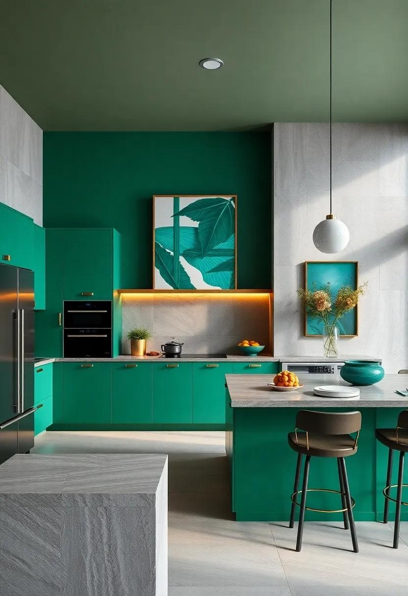 To further play with contrast and visual intrigue, consider integrating different materials that can showcase these vibrant shades.For example, you can pair emerald-hued tiles with brass fixtures to produce an elegant juxtaposition or place white marble countertops beside deep green signals to elevate the design further. The beauty of this color palette lies in its versatility,allowing you to mix textures such as matte paint with glossy finishes that not only create a stunning visual experience but also invite tactile interaction for a holistic luxury kitchen feel.