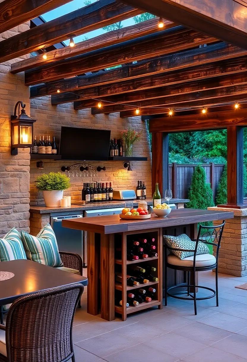 Bohemian Bliss: A vibrant patio bar adorned with eclectic accessories pairs beautifully with a handmade wine rack, ideal for free-spirited gatherings filled with laughter