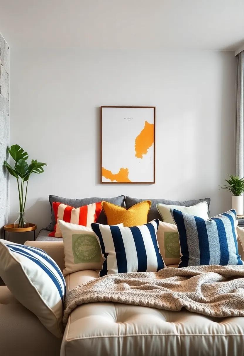 Incorporating a mix of striped and solid-colored pillows into your boy’s room creates a dynamic and inviting space that exudes both coziness and sophistication. Striped pillows can introduce a playful, energetic vibe while solid-colored cushions can offer a grounded feel. Together, they play off each other beautifully, making it easy to achieve that layered, collected look that elevates the decor. Consider using bold colors for the solids to contrast with softer striped hues, or vice versa, to ensure a balanced aesthetic. This approach can make a big difference in the overall ambiance.