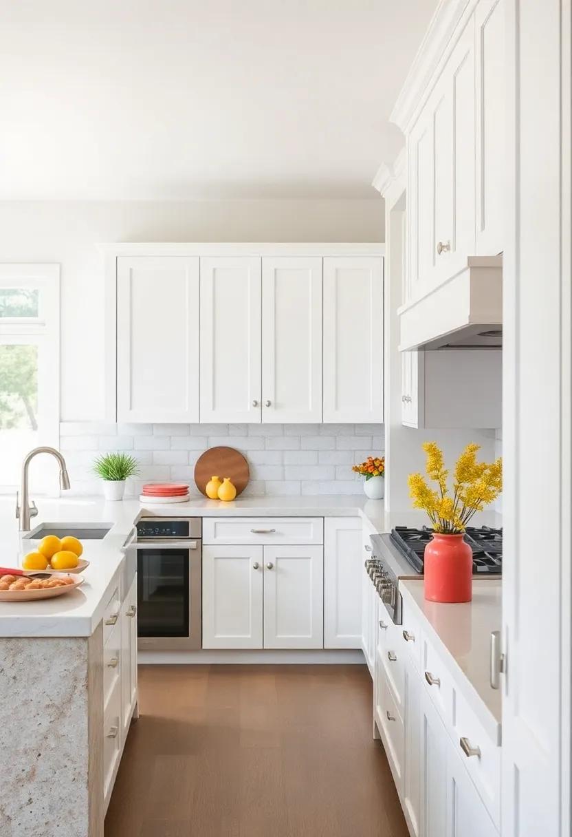 - Accent Walls: Paint a wall in a coral or sunny yellow to create a focal point that complements your white cabinets.