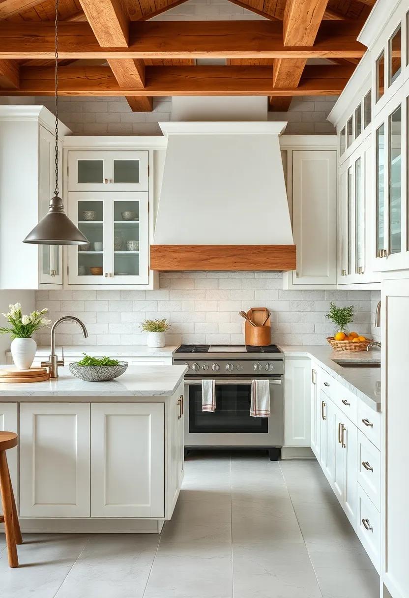 Farmhouse Chic: Delight in the combination of distressed white cabinets and rustic wooden beams, merging coastal charm with farmhouse elegance