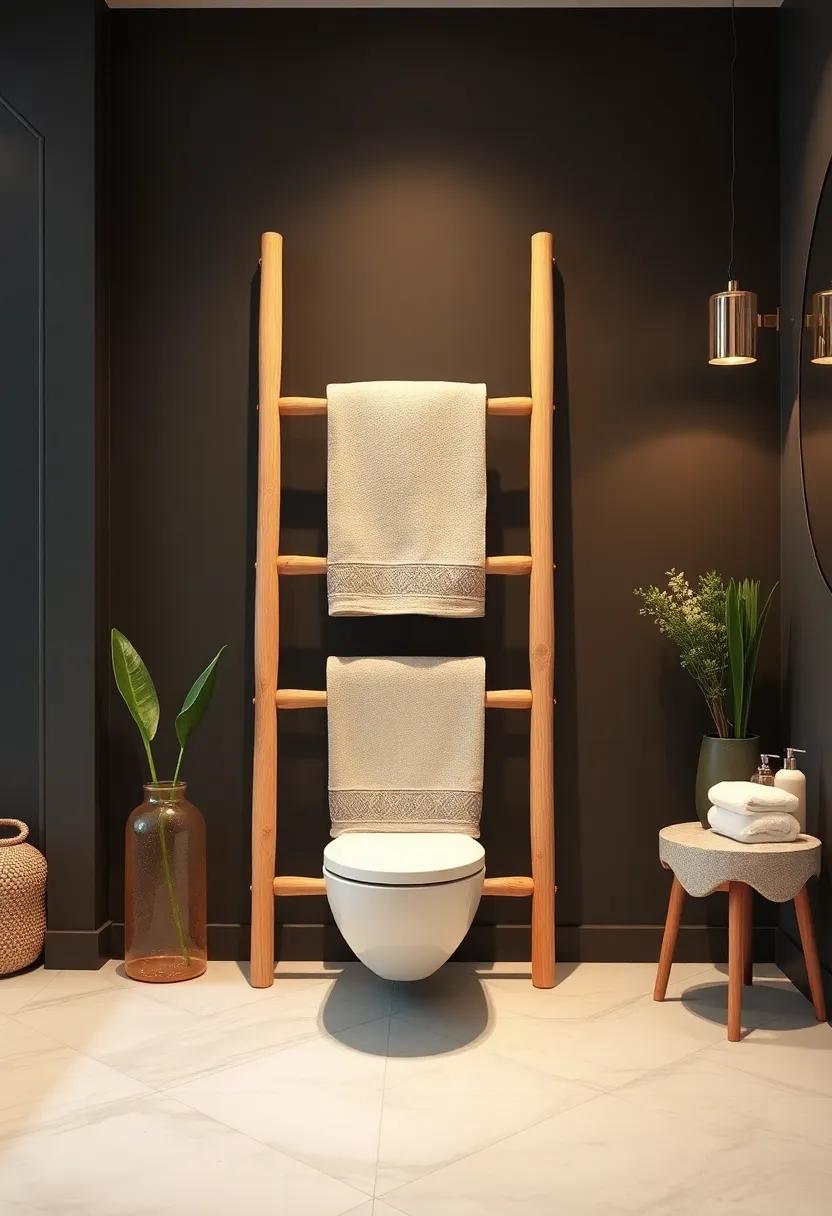 DIY Wooden Towel Ladder: Build a minimalist towel ladder from wooden dowels to hang your towels while adding a unique decorative element
