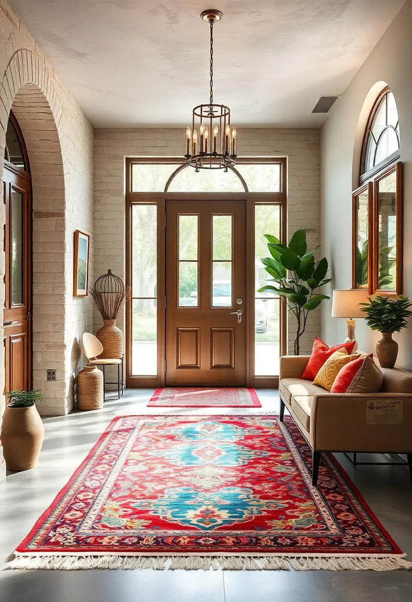 Embrace eclecticism with a mix of small, colorful rugs that define separate zones in a grand entryway, creating visual interest