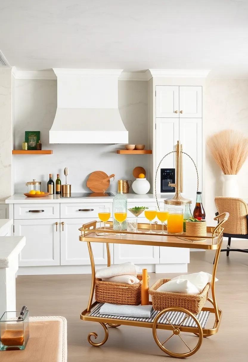 Beachy Bar Cart: Introduce a chic bar cart stocked with summer cocktails and beach-themed glassware, perfect for hosting gatherings