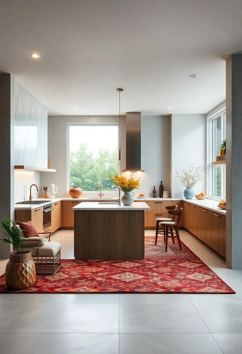 When selecting rugs, consider layering options to accentuate distinct zones in an open-plan kitchen. Use oversized, decadent rugs to delineate the lounging area from the cooking space, showcasing each function while enhancing style. Adding a softer rug under your sink can also make daily tasks more enjoyable, as it cushions your feet and adds character. Explore choices that are not only aesthetically pleasing but also durable and easy to clean, ensuring that your elegant rugs maintain their beauty for years to come.