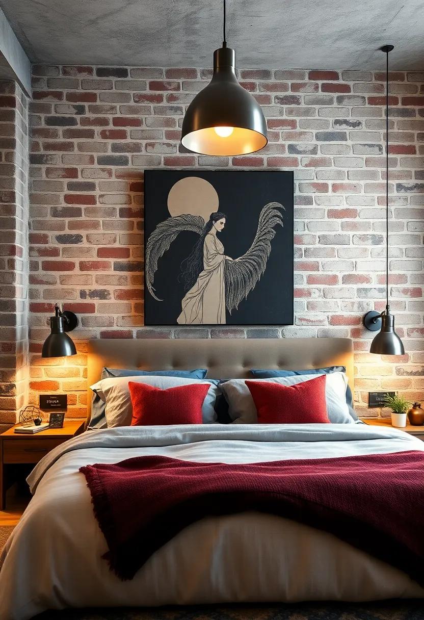 Industrial Chic Lighting: A statement metal pendant light hangs above the bedside tables, adding a touch of modern elegance while illuminating the rich textures of brick and concrete walls