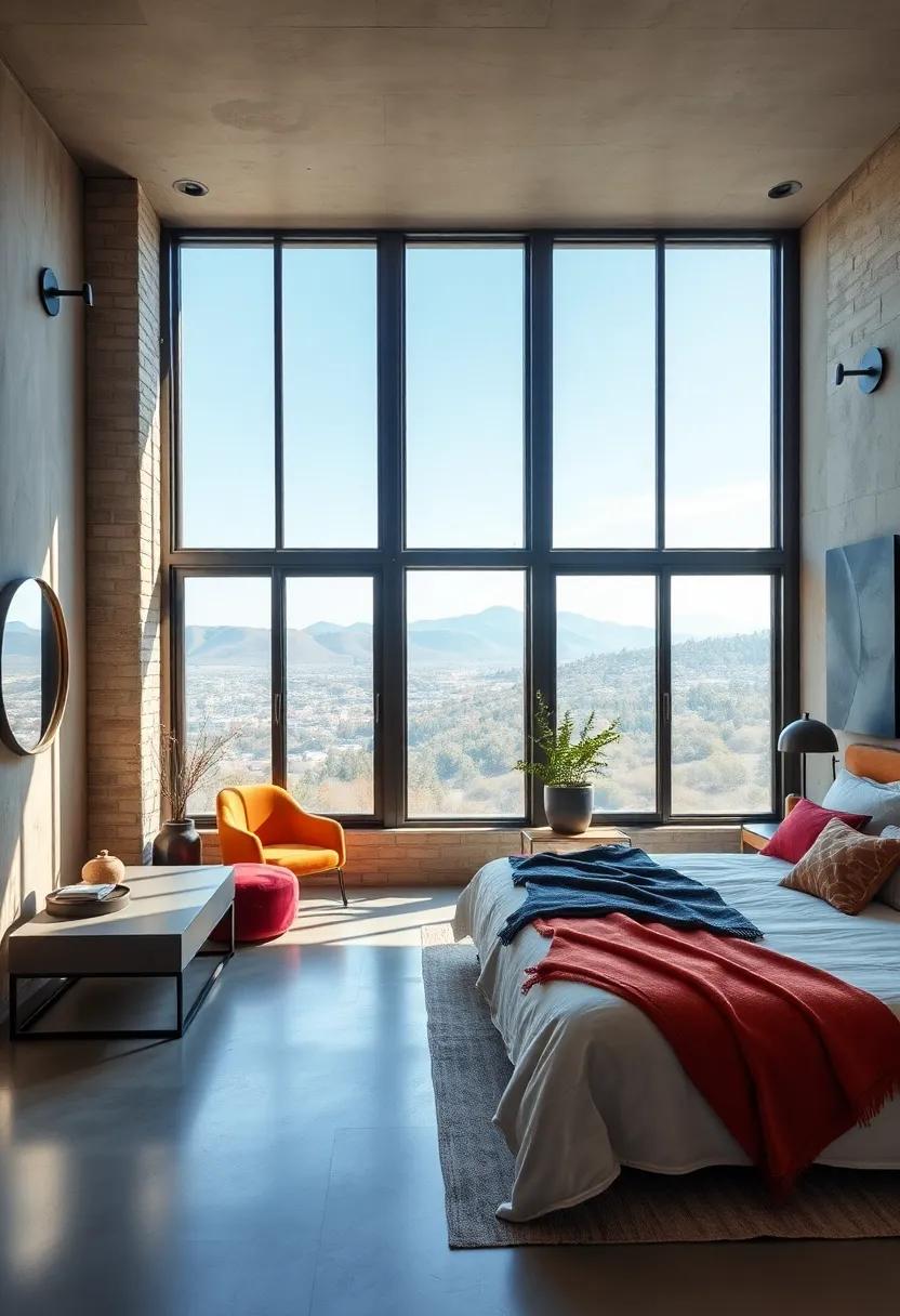 Industrial Window Frames: Large, metal-framed windows invite natural light and breathtaking views, enhancing the open feeling of the space while creating a striking visual effect