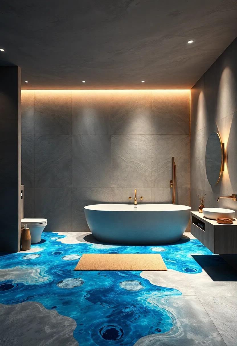 Immerse yourself in an avant-garde sanctuary where the delicate interplay of blue and turquoise mosaics creates a mesmerizing illusion of ocean waves gently rolling across the bathroom floor. This design aesthetic transports you directly to an underwater haven,inviting you to relax and escape the demands of everyday life. As you step onto the textured tiles, you’ll feel as if you’re walking through a serene lagoon, accentuated by the shimmering reflections of light that dance off the tiles, enhancing the overall ambiance of tranquility.
