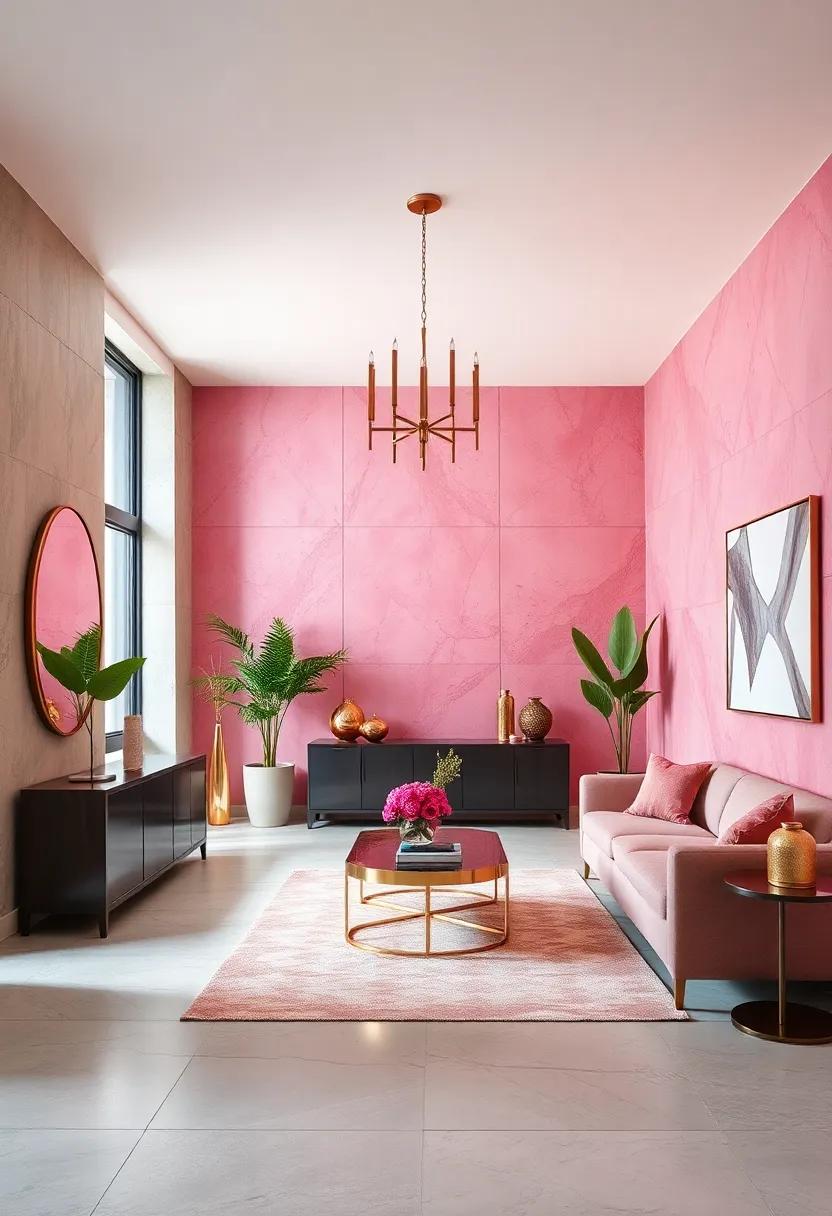 Get inspired by a pink statement wall in a living room, accessorized with rose gold accessories that create a harmonious balance