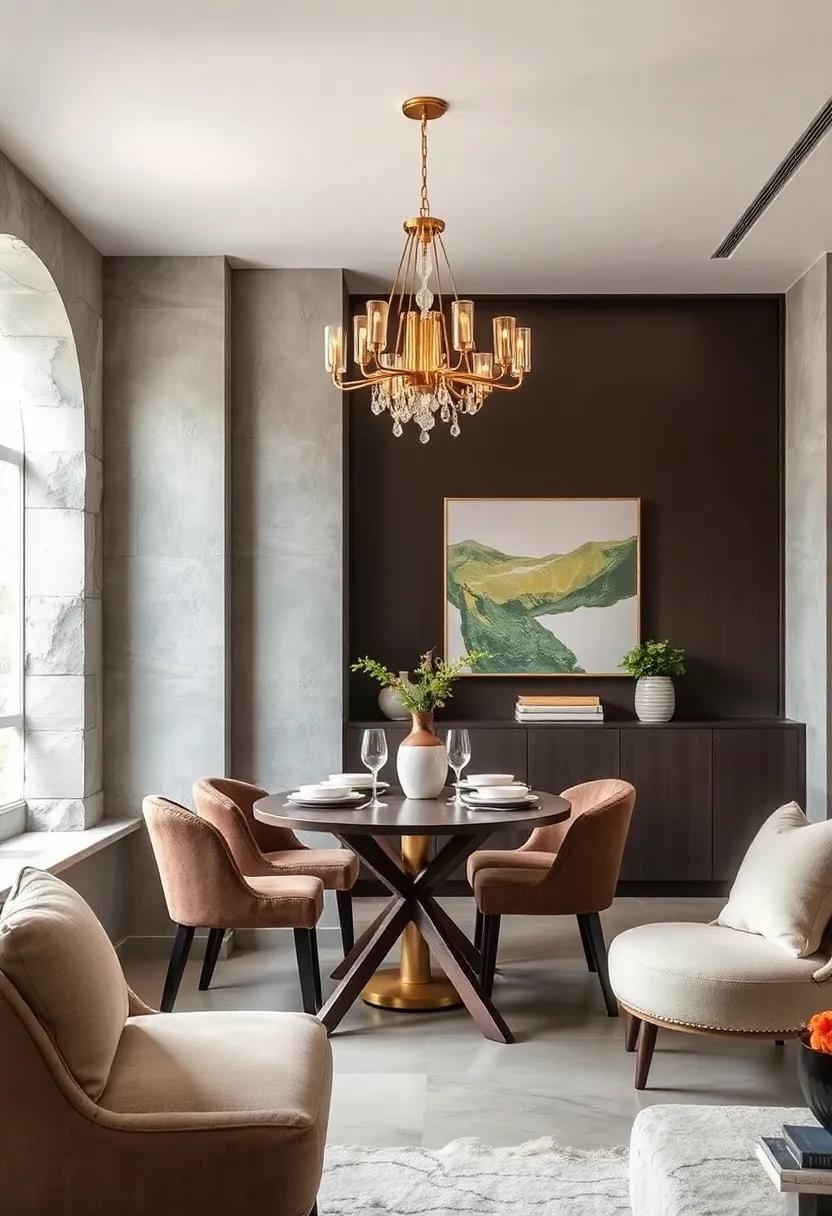 The allure of deep green walls creates a rich backdrop that breathes life into any small dining room. Brass fixtures, shining like scattered stars, harmoniously contrast with the earthy tones. Their warm glow not only illuminates the dining experience but also invites an air of elegance and sophistication. The room is artfully adorned with a stunning art piece that hangs above the dining table—its intricate design and bold colors serve as a captivating focal point, demanding attention and sparking conversation among guests. As guests gather, the atmosphere transforms into a chic enclave where art and design intertwine seamlessly.