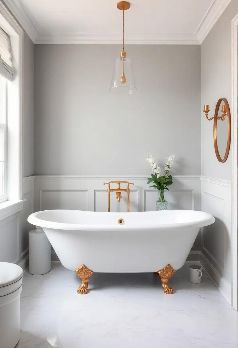 Timeless elegance is found in a soft gray-toned bathroom, where a white clawfoot tub is beautifully complemented by antique brass fixtures