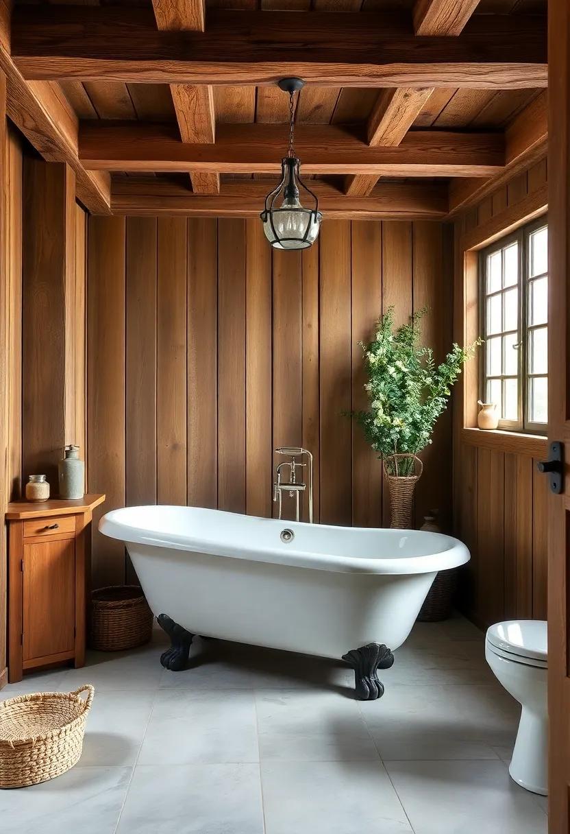 A rustic-chic approach shines through with wooden beams, a vintage clawfoot tub, and farm-style elements that blend seamlessly for a warm ambiance