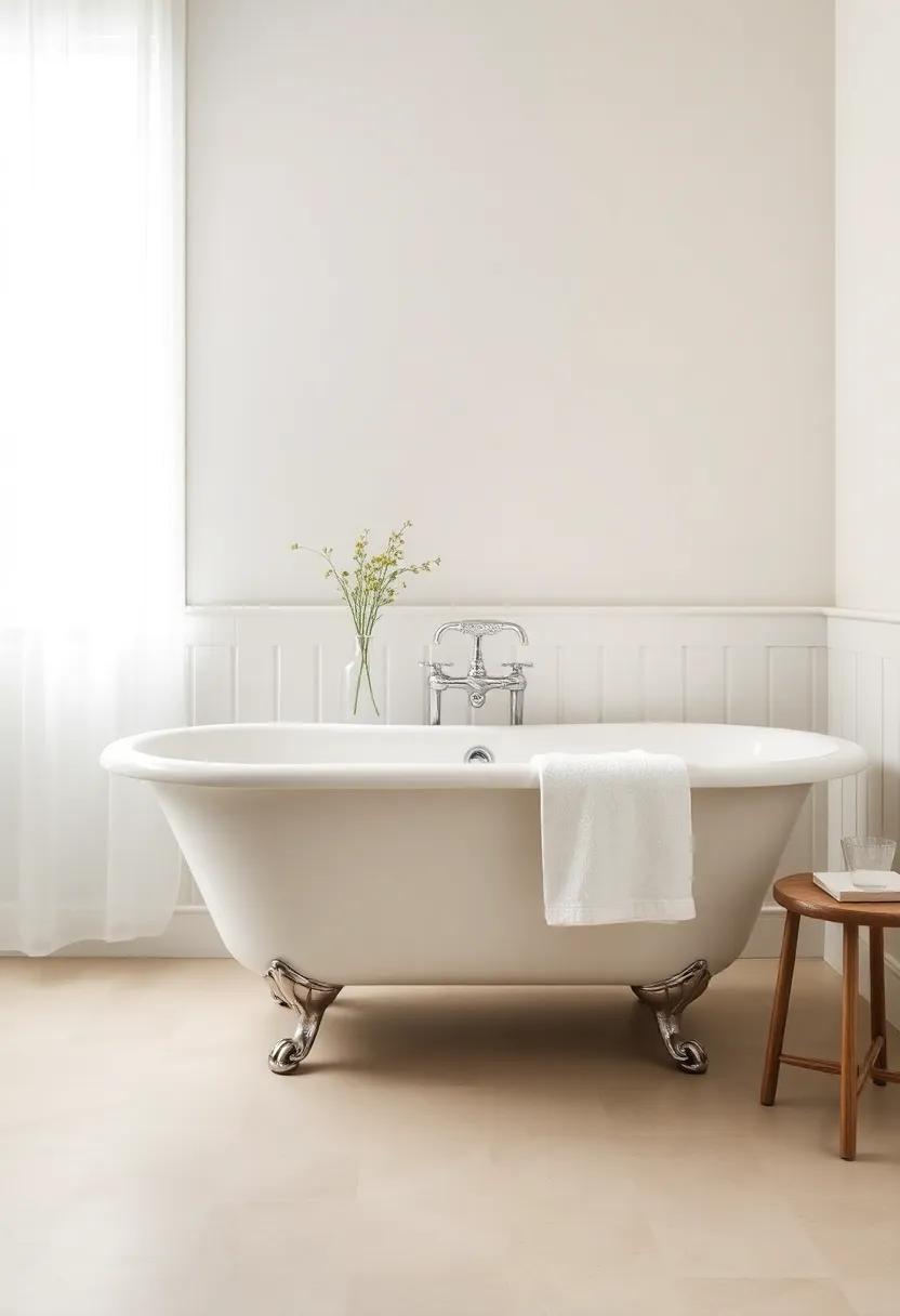 A bath immersed in simplicity, featuring a classic clawfoot tub paired with a muted color palette invites a sense of calm and relaxation