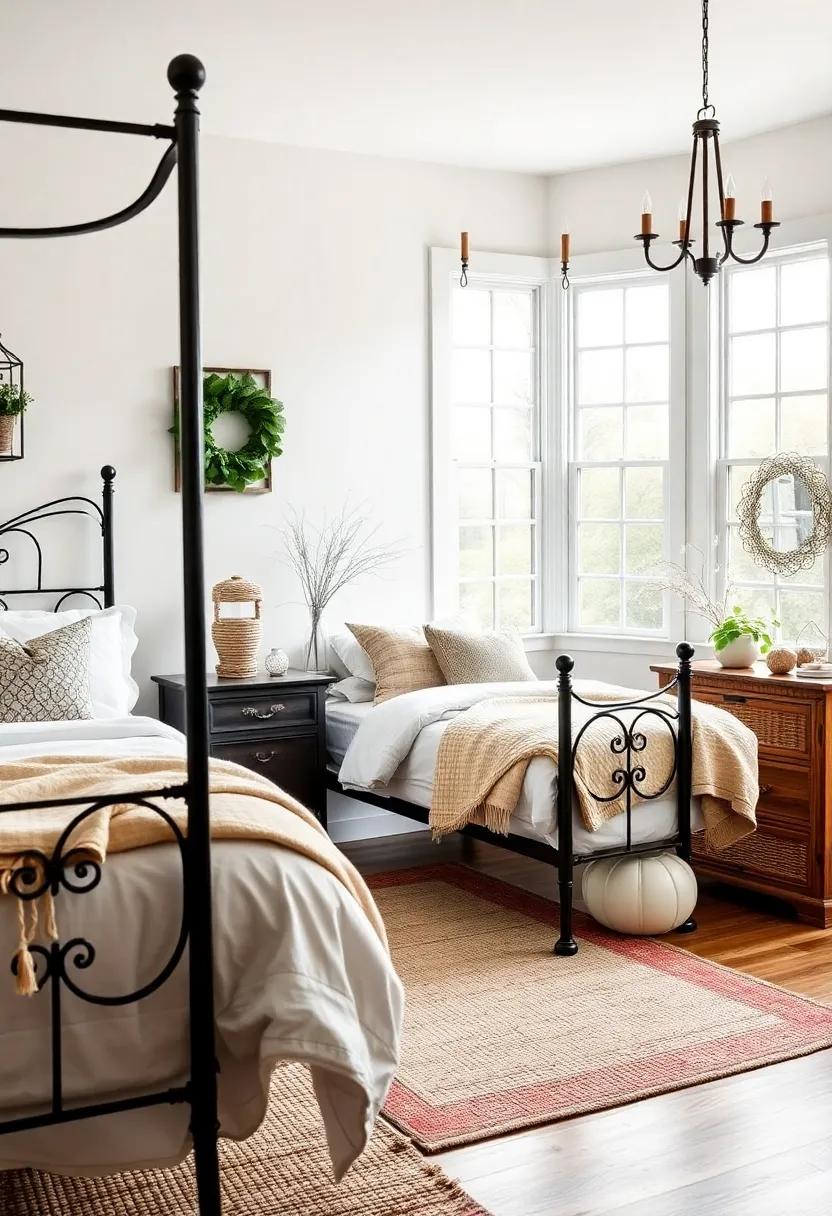 Adding seasonal decor to wrought-iron accents can elevate your farmhouse bedroom to new heights. As the seasons change, so can the character of your space. For a cozy fall vibe,consider draping a rich,burnt-orange throw over your wrought-iron bed frame and placing small pumpkins along the headboard. In winter, white fairy lights wrapped around the iron railing create a dreamy, magical atmosphere, while flanking the bed with evergreen branches brings a fresh touch of nature indoors. Transitioning to spring calls for vibrant pastels; swap out heavy linens for lightweight,floral-patterned bedding and add some delicate blossoms in a rustic vase on the nightstand. Summer invites a fresh look with crisp white linens paired with cheerful, sun-kissed pillows that digitally pop against the robust details of wrought iron.