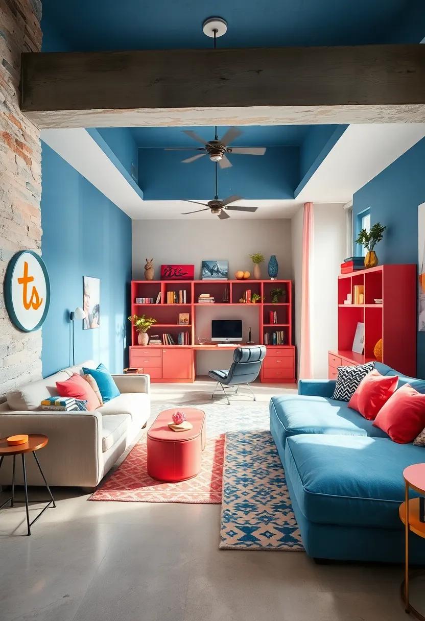 for relaxation areas,incorporate plush cushions and floor pillows in varying shades of blue and coral. A low coffee table can be creatively styled with magazines and art supplies, inviting relaxation and creativity. Introducing a bean bag chair can provide an extra layer of comfort for reading or hanging out with friends. Adding a small plant or a piece of artwork can breathe life into the space and open the room visually. Utilize a soft rug to ground the area, offering a tactile element that makes the nook even more inviting.