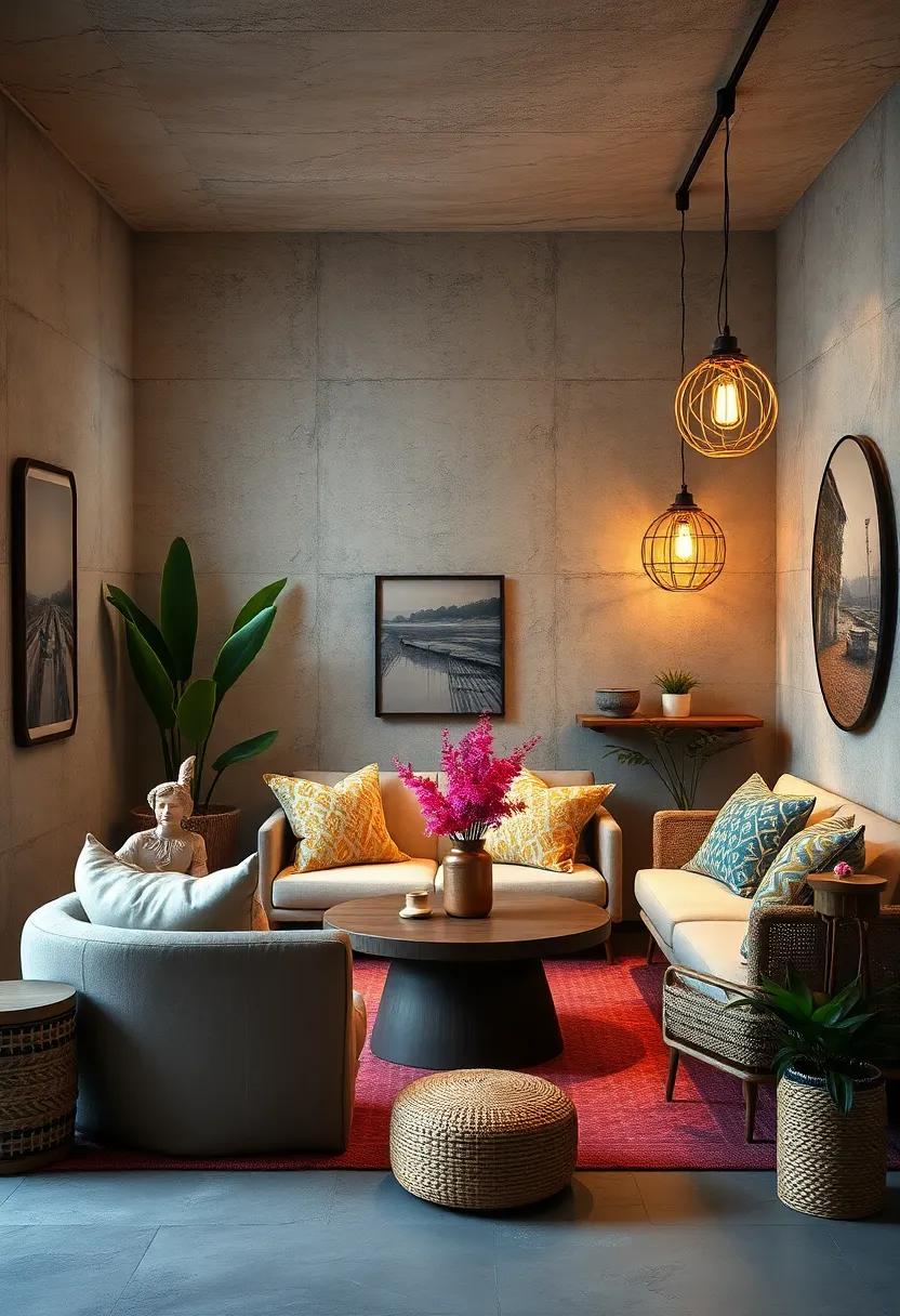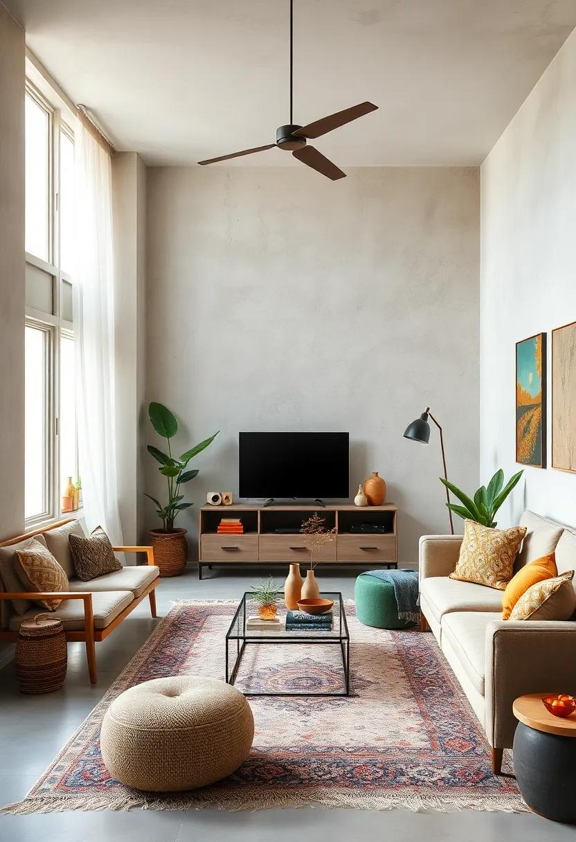 To enhance the eclectic vibe further, play with layering techniques. Start with a base layer of a solid color on your sofa, then mix in patterns with cushions and throws.Ground the ensemble with a richly textured rug that ties everything together. You can also create a visual centerpiece by hanging a mix of textiles on the wall, such as woven wall art alongside funky fabric scraps. For a finishing touch, arrange potted plants amidst the various textures to breathe life into the space. Consider creating a simple table like this for fast reference: