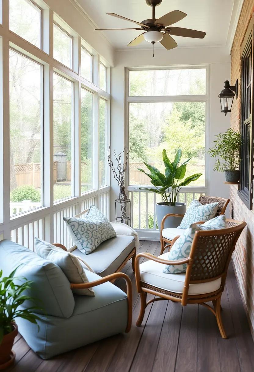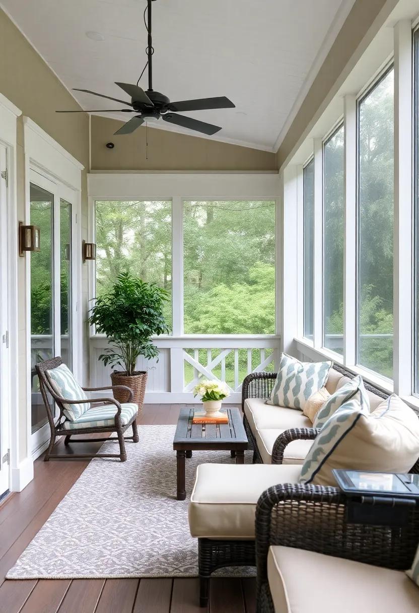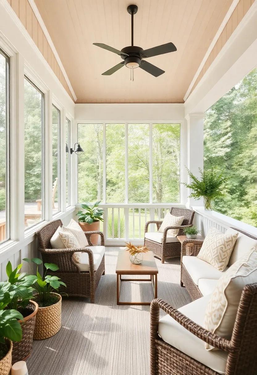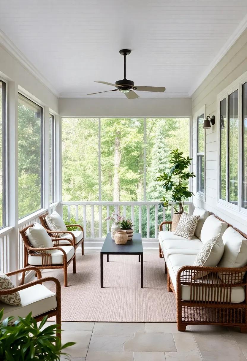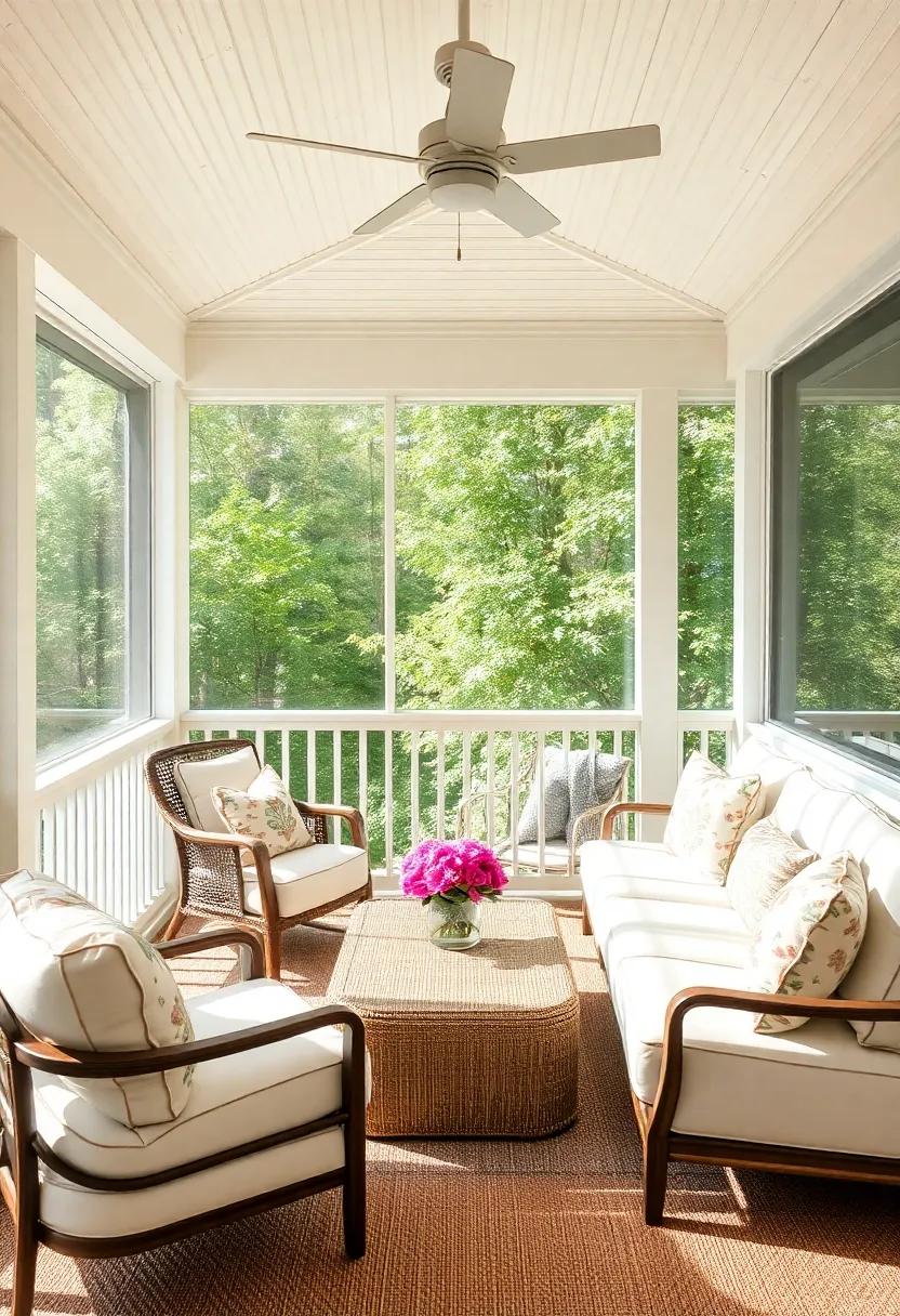 Incorporating soft furnishings is key to maintaining a cozy vibe. Use plush throw pillows and lightweight blankets to encourage lounging without feeling cramped. Opt for light colors and delicate patterns that reflect your personal style while keeping the space airy. Additionally, consider using multi-functional furniture, such as an ottoman that also serves as storage. A well-placed bench or storage seat that hugs a corner can provide extra seating and space to tuck away items for a clutter-free look. By emphasizing a thoughtful layout with well-chosen textiles, your screened porch can become an intimate retreat where comfort and style coexist seamlessly.